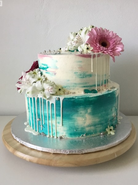 Torta určená na svadbu ako svadobný dar. Vanilková a čokoládová s bobuľovým ovocím.